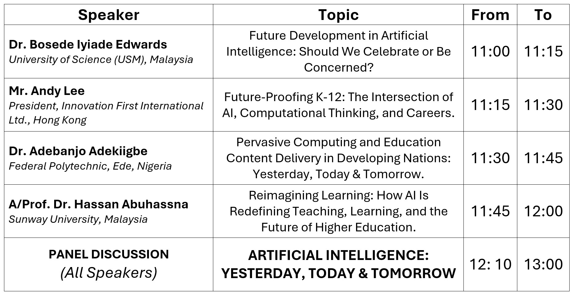 • “Building AI Literacy with Young Learners” 4th Integrated STEM Leadership Summit in Asia. Thailand (2024)